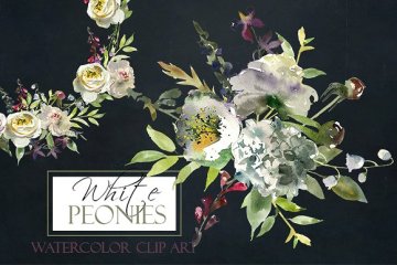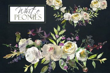 白牡丹花束花圈和元素水彩剪贴画集合。非常适合婚礼,婴儿淋浴邀请卡,贺卡,printables,墙艺术,徽标,网页和博客设计,邀请等等。