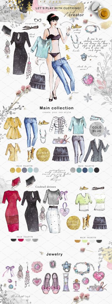 当你还是个女孩的时候,你喜欢玩洋娃娃吗?这是一个非常有趣的服装创作者制作时尚的肖像与不同的服装,你可以在你的网上商店或博客等使用...为了使你的设计华丽,我已经包括小时尚的设计元素和可爱的水彩形状。请参阅封面中的所有示例。