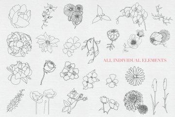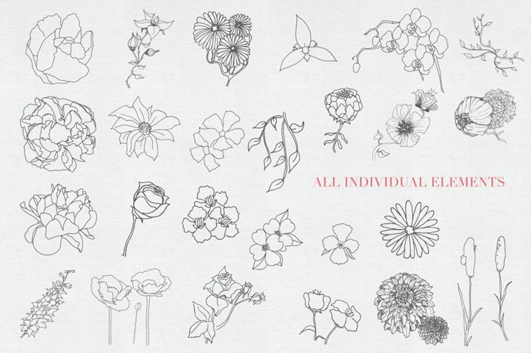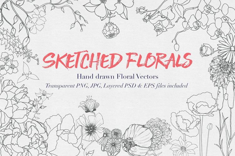 25个独特的草绘花卉图像。提供矢量EPS,PNG,JPG和分层PSD格式,透明背景。创建自己的徽标或用于剪贴簿,邀请函,文具......你能想到的任何东西!每张图片至少3500px,300dpi。