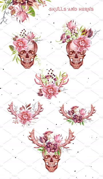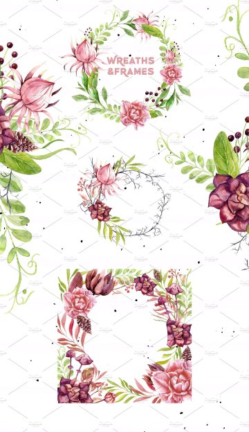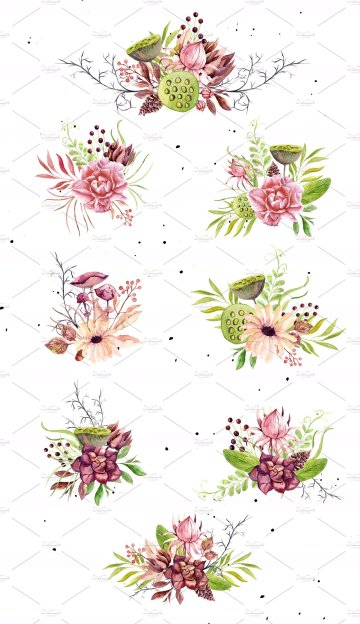 该套餐包括63个水彩插图:鲜花,玫瑰,树枝,干花,浇筑,橡子,莲花,豌豆枝,人类头骨,动物角,南瓜,锥体,罂粟盒,元素花束,框架和花圈。您也可以使用创意邀请。