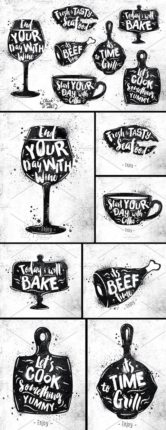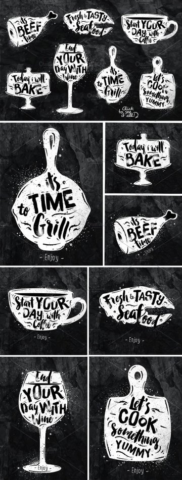 设置食物标志海报画与在黑板和肮脏的纸背景的黑白油漆。通过在键盘上书写字母来概述文本并且不可编辑。
