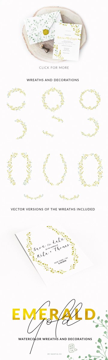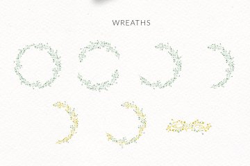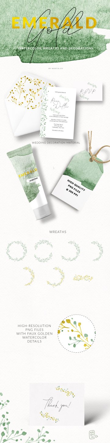 这组水彩花环和装饰元素的合集包括了8个水彩翡翠黄金花环,可以用于婚礼设计项目,社交媒体模板背景,包装和纺织品等您能想到的任何设计项目。