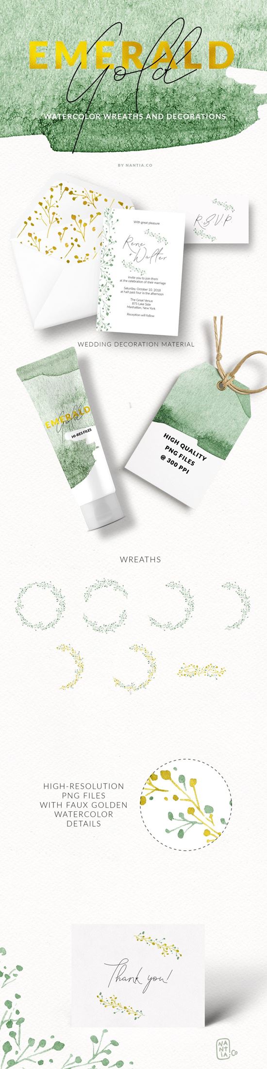 手绘水彩翡翠绿植物花卉花环设计素材 Emerald-Gold