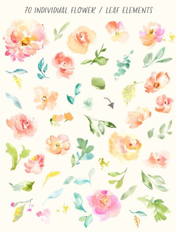 超过70手绘水彩花卉,叶子,茎和其他水彩元素。这些花卉元素作为具有透明背景的高品质PNG图像。