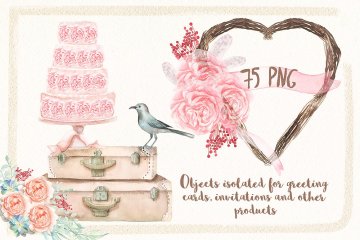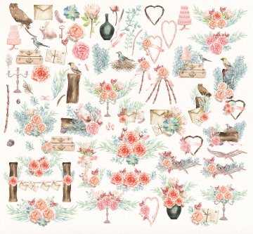 套餐包括: 75 PNG 水彩插图:复活节兔子,猫头鹰,英国桃玫瑰,桉树枝,婚礼蛋糕,水彩,手提箱,巢,羽毛,鸟蛋,复古字母,丝带,仿古烛台,瓶,变形杆菌,肉质,棉花,瓜叶菊,珠子,珍珠,钥匙,竹子,木心等等。