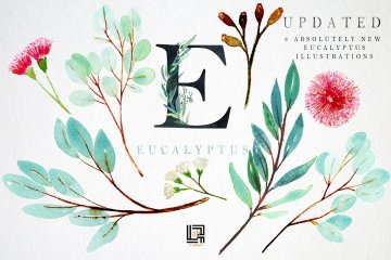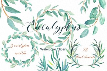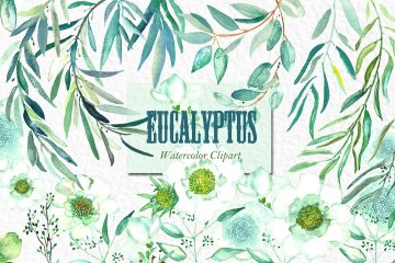 手绘水彩桉树树枝树叶设计素材 Eucalyptus.-Wat