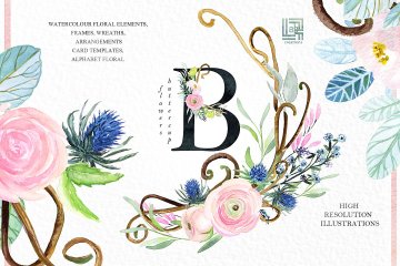 Watercolot花卉元素,嫩框架,柔和的粉彩花圈,原始花束和安排,预制卡模板,独特的花卉字母表。