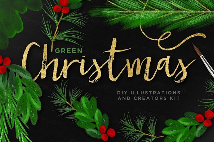 图穷联素材库 » 手绘水彩绿色植物装饰素材 Green-Christmas-D