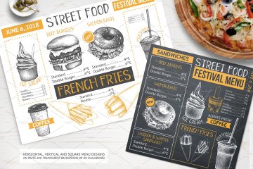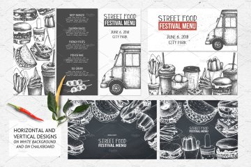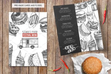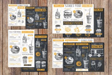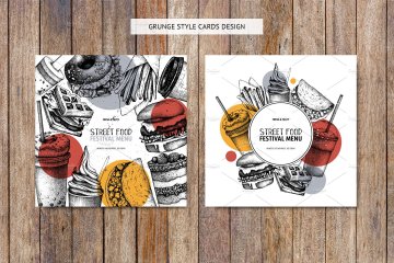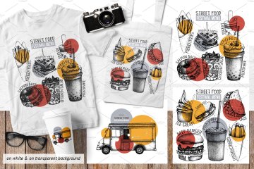 这组合集包括了快餐餐厅,咖啡馆或食品卡车等设计元素,所有的元素都是手绘、扫描后转换成高质量的数字文件(使用跟踪操作)。
