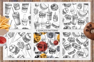 图穷联素材库 » 矢量手绘快餐餐厅美食插画素材 Fast-Food-Resta