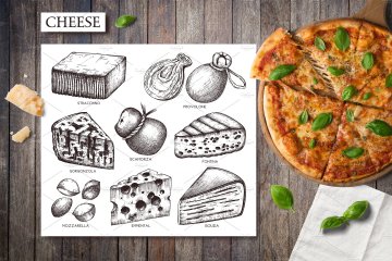 这组合集包括了60种披萨配料和食品元素,包括蔬菜,比萨饼,比萨饼面团,奶酪,肉和海鲜等。所有的元素都是手绘,扫描和转换成高质量的数字文件(使用跟踪操作)。