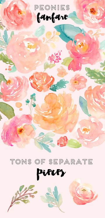 Peonies fanfare是一个异想天开的剪贴画收藏品,包括大量的水彩牡丹花,叶子,茎和附加物。非常适合创造自己的花卉组合。这些手绘水彩画作品将为您提供完美的婚礼邀请,水彩画博客标题,徽标等等!