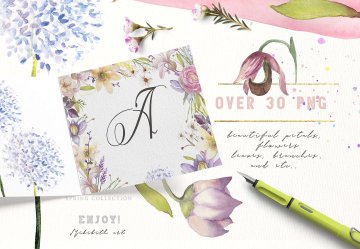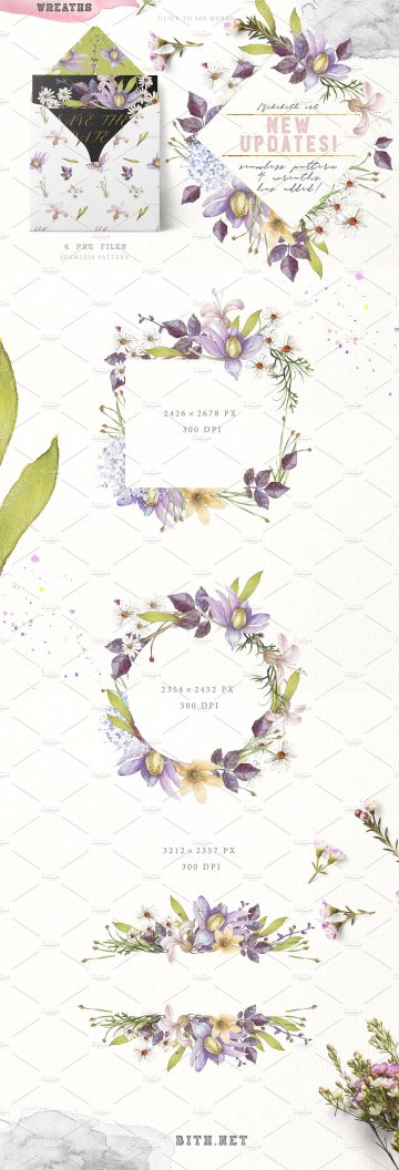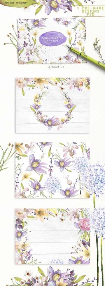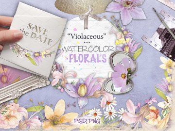 这组紫罗兰色水彩花卉插画素材合集包括了PNG和Psd文件的水彩元素和背景,所以文件大小不同!!