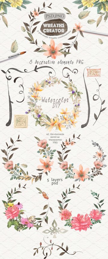 “Wreaths creator”{203,2 mb} 1 psd分层设计,6个花圈,6枝,4个装饰摆件16 PNG
