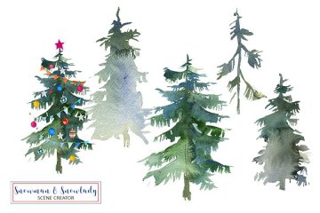 * 15个独立的PNG手绘水彩人物和元素:2个雪人,lattern,chikadee鸟,杉树,圣诞树,树枝。
