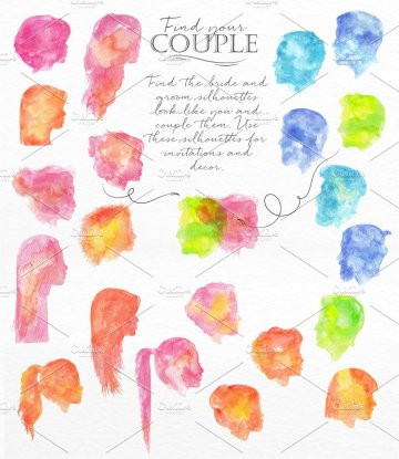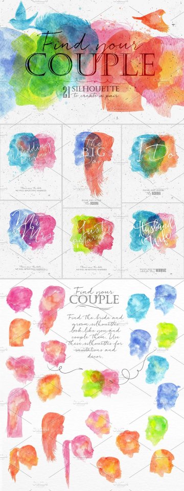 你将得到21个独特生动的新人面容图案,你可以找到像你这样的新郎和新娘的剪影,然后把他们配对。这些剪影是作为请柬等装饰项目的理想元素。