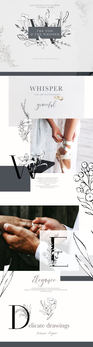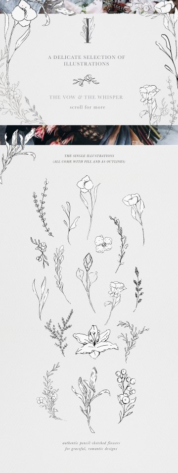 欢迎来到一个巨大的现代浪漫,充满了许多精致的草图,字母和更多!“The Whisper”是一种优雅精致的花朵选择,轻轻地手绘和精心数字化,以保持原始的柔软神韵和工匠铅笔素描的自然流动。
