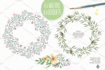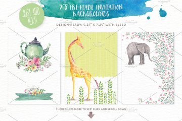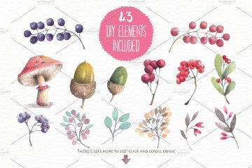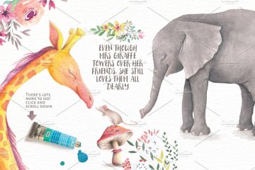 这组水彩动物&花卉插画合集包含了超过110种元素,包括预制的商标、花朵、花环和图案,这个异想天开的组合可以为任何设计项目注入神奇的色彩。