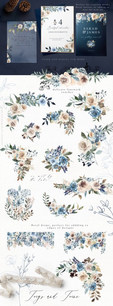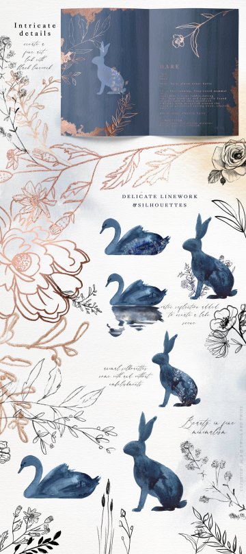 这组插图和图形元素的灵感来自于雾蒙蒙的黎明,包含了一系列的植物轮廓,为你的设计项目提供了一个更简单的外观,这可以与水彩插图相搭配,以获得更多的深度和细节。
