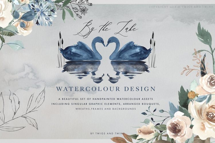 手绘水彩浪漫花卉湖边丛林元素设计素材 Graphic-Set