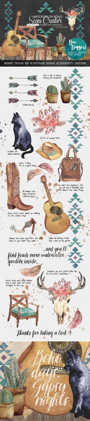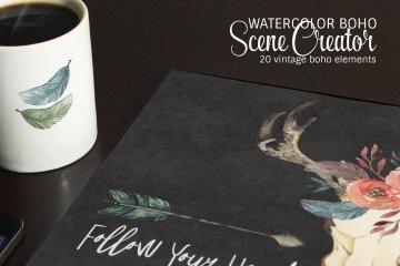 介绍我的超级详细的水彩波西米亚风景场景造物主与复古波西米亚元素在分层PSD。移动图像以创建您自己的定制波西米亚风格空间。