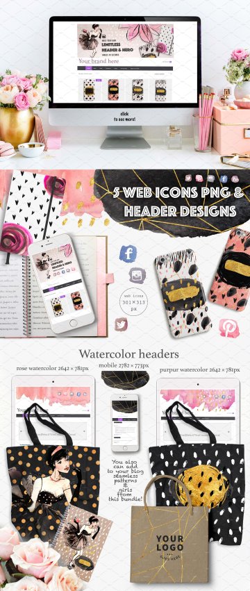 设计创建者文件夹:1件装饰+ 1 eps无缝图标,9横幅,1 psd设计创作者,9 jpeg,12 PNG,4 BONUS WATERCOLORS JPEG,超过40种图案jpeg,8无缝PNG