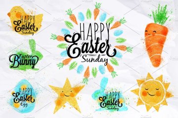 这组彩色儿童风格的复活节主题可爱矢量图形带有太阳,鸡,鸡蛋,兔子,胡萝卜,星星等元素,这些明亮有趣的元素使你的设计项目看起来更有趣!