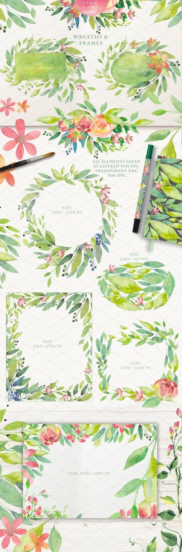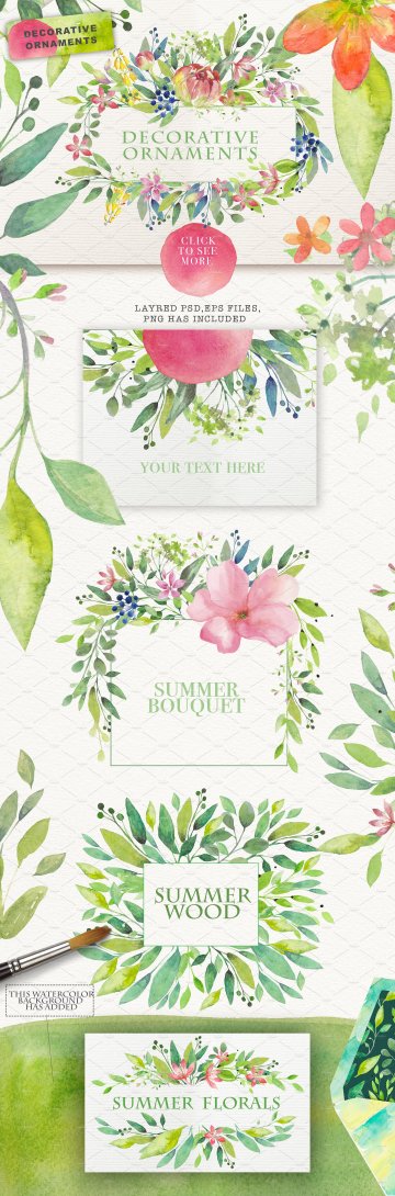 这组夏日主题的花卉、绿叶水彩对象、纹理&花卉花框素材合集包括了32个png文件。