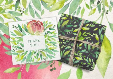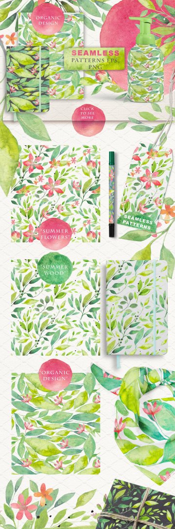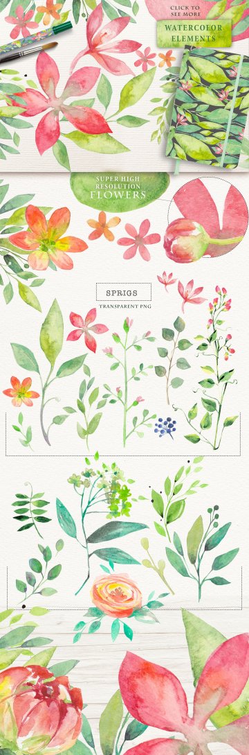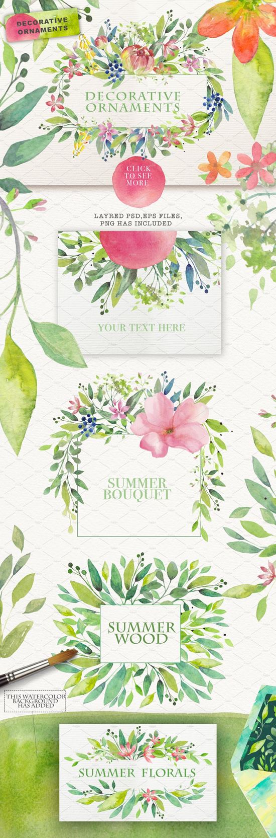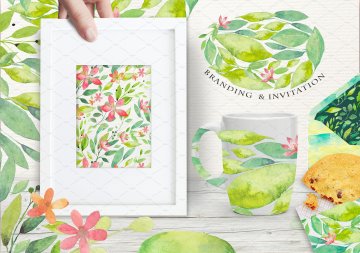 夏日主题手绘水彩花卉绿叶设计素材 SUMMER-BREEZ