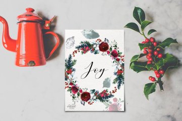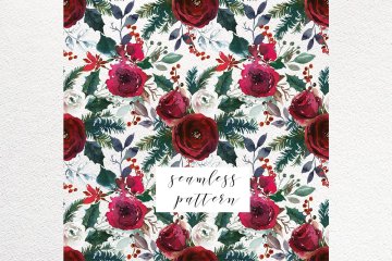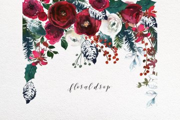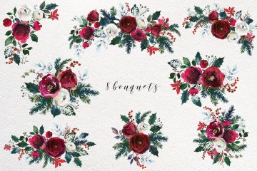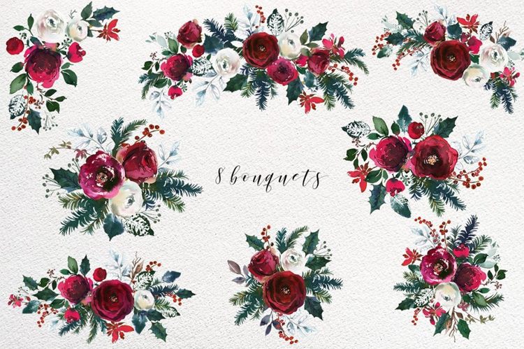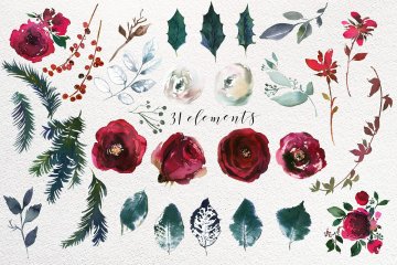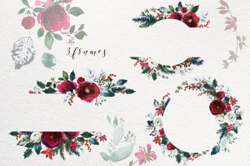 这组圣诞节氛围水彩花卉剪贴画合集包括了优雅的花束,美丽的花环,手绘元素,漂亮的框架,无缝图案和设计文件,你可以将它们用于设计邀请函,墙壁艺术,日历,博客设计,纺织品装饰,剪贴簿等更多项目!