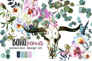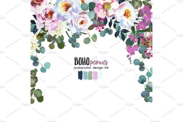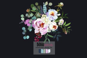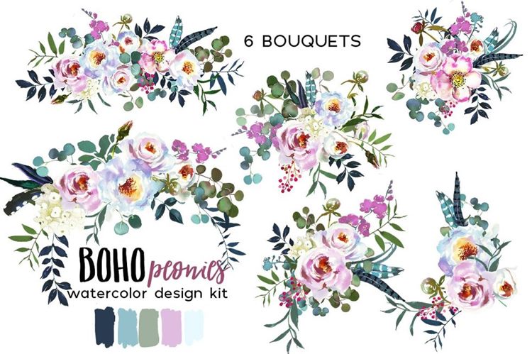 Boho Peonies水彩花卉系列包括花束,花圈,花卉水滴,相框,图案和独立元素。非常适合婚礼,婴儿淋浴邀请卡,贺卡,printables,墙艺术,徽标,网页和博客设计,邀请等等。