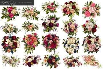 有20种全彩色花束,颜色包括淡粉色,薰衣草色,奶油色,白色,紫红色,酒红色,海军蓝色,红色和紫色。还有20个单色黑白相同的花束。适合不同效果的分层和混合。无论是彩色还是单色,每个花束都可以在浅色或深色背景下完美搭配。这些花束都是PNG格式,透明背景,高度或宽度都接近4000像素。