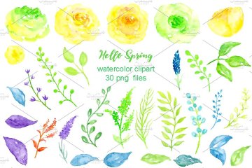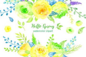 “您好,春天”-水彩花卉剪贴画带有亮黄色的玫瑰和绿色的玫瑰等装饰元素,是完美的用于DIY婚礼请柬,博客标题,花卉信件,艺术版画,贺卡和墙壁艺术等项目的理想元素。