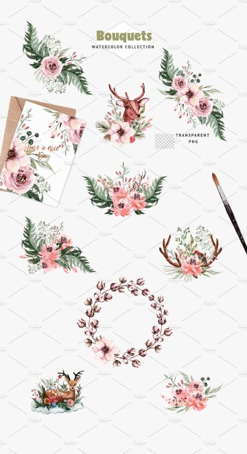 32个透明的PNG文件—绿色的树枝,树叶,花玫瑰,海葵,牡丹花,树枝,蕨类植物,松针,球果,鹿,鸟等。