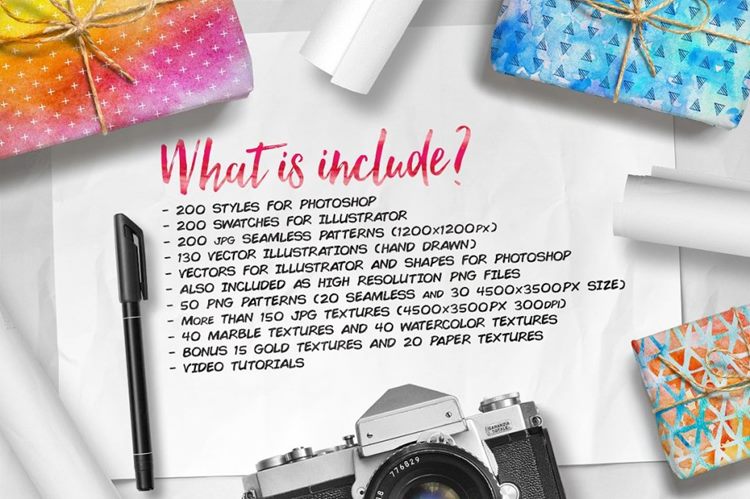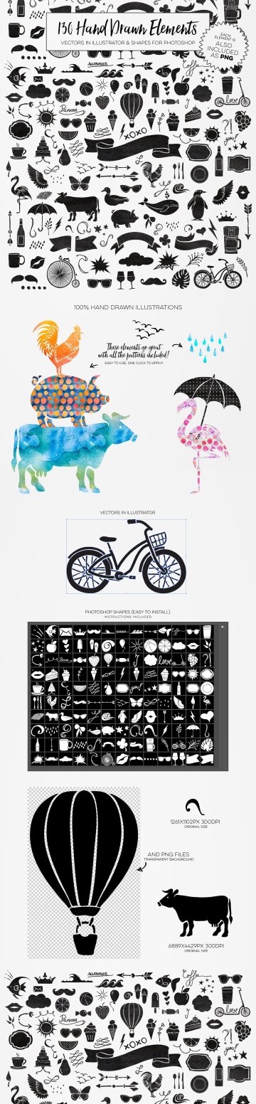 这组合集带有200种风格的Photoshop插画样本,超过200款高分辨率的JPG和PNG纹理和图案,还有130款手绘插图!