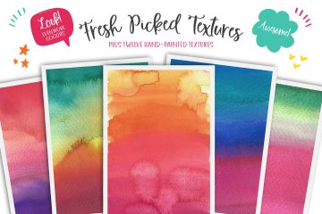 这组合集里面有超过55种手绘水彩画,3种新字体,包括1种数字字体,里面有很多手绘的附加部分,6个现成的logo和一套全新的水彩画纹理!