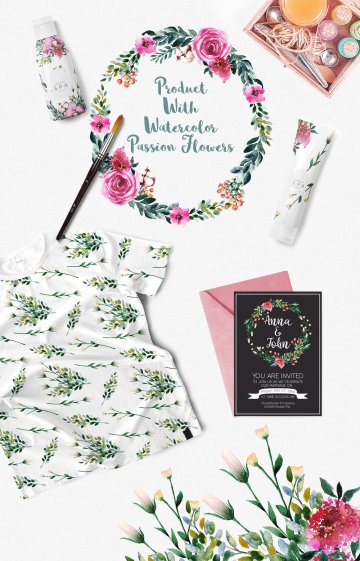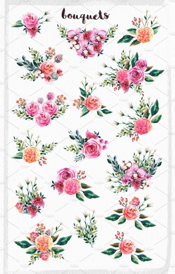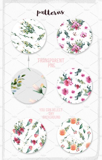 这组合集包括了1个PSD分层文件,45个PNG元素:兰花,玫瑰,康乃馨,丁香,桉树枝,浆果等,还有5个透明背景的PNG无缝图案,你可以在Illustrator和Photoshop中使用它们。