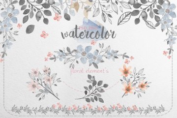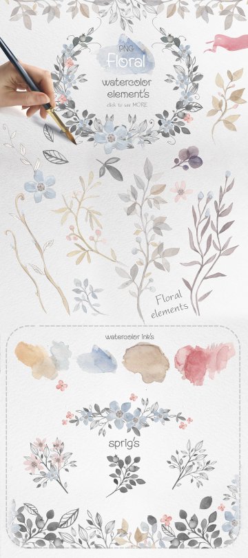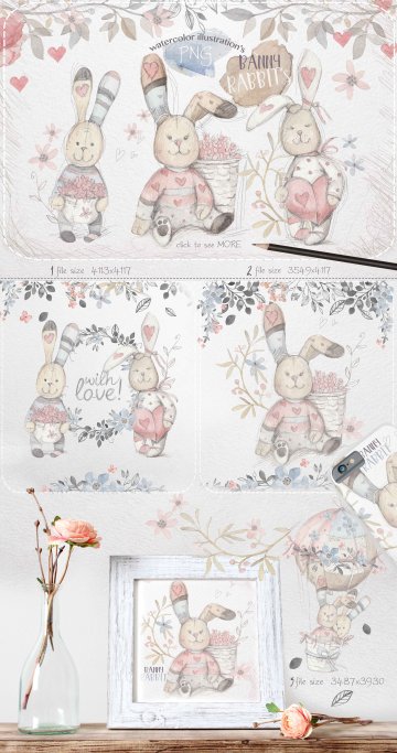 这是一组带有可爱的兔子、花卉、树枝等元素的水彩插画合集,可用于你的任何设计项目。