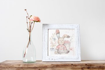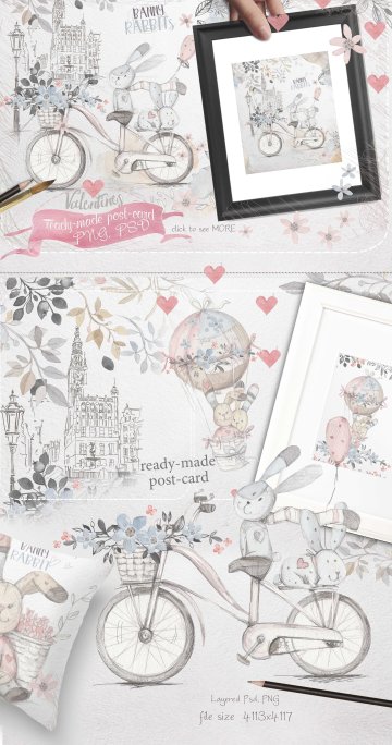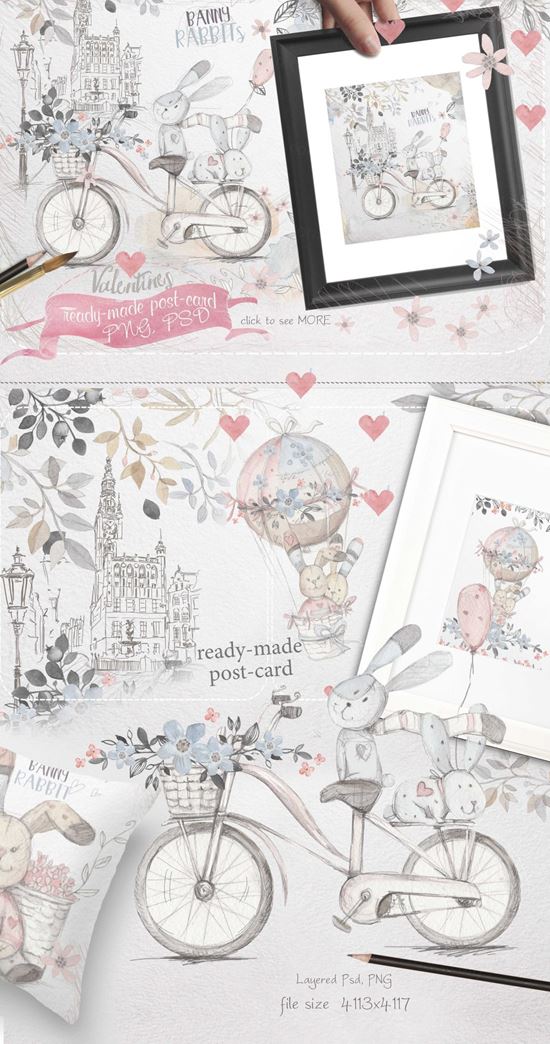 14个分层的PSD元素:兔子,花卉框架,树枝等。