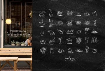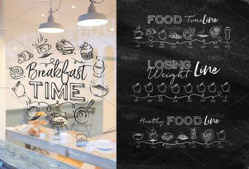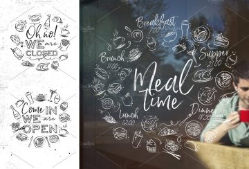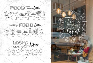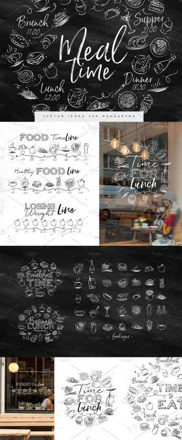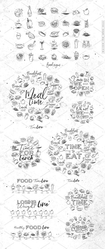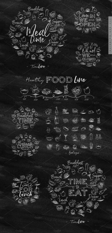 这组素材合集是绘制在脏纸和黑板背景上的老式食品图标和字母组合,这些文字是在键盘上书写,不可以编辑。