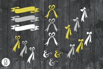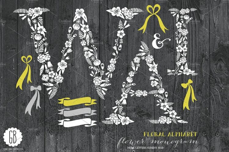 这组合集包括了9个设计元素:3个白色的花卉字母(W A I),5个丝带和3个颜色的“&”(灰色,黄色,白色)。总共43个独立的数字文件。