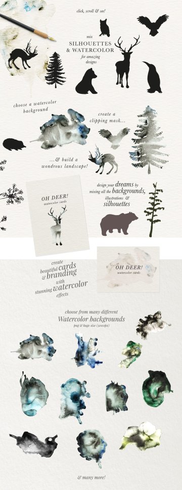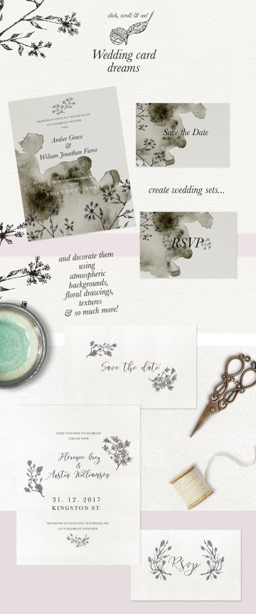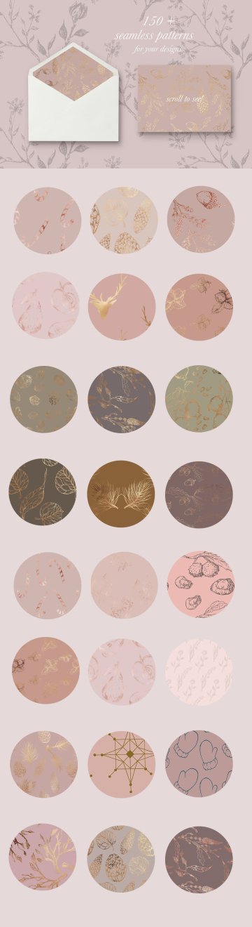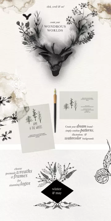 您可以通过组合图案,手绘插图,然后添加一些水彩作为背景或叠加,轻松地制作完整的设计。滚动上面的图片,发现奇妙的世界,神话般的色彩,优雅的安排和花圈,你将收到手工制作的图纸和闪亮,优雅的无缝模式:)