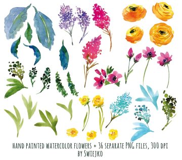 这组美丽浪漫的剪贴画合集包括了36个手绘花和树叶元素,它们都是用水彩颜料手工绘制的。可用于设计婚礼请柬,贺卡,礼物标签或者作为你的商店、博客横幅等其他项目的理想装饰也是完美的。