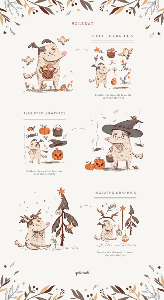 “One Dog Story” 是一个由130多个独立图形元素组成的集合,由可爱的狗主演。角色拥有18种不同的身体姿势和面部表情,可帮助您为您的产品或信息营造一种特殊的情绪。