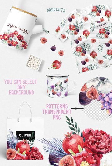 套餐包括:37种PNG鲜花和花束,9种PNG 无缝花朵图案,浆果和水果。