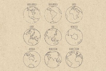 地球七大洲四大洋素描插图素材 Sketches-of-the
