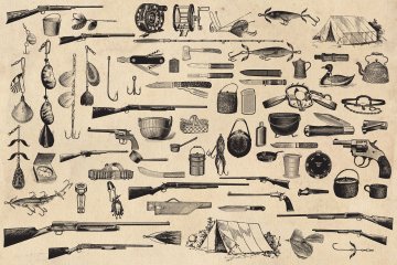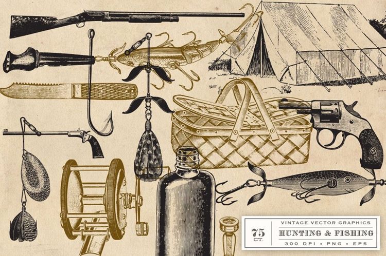 图穷联素材库 » 复古老式手绘狩猎露营主题工具武器插画素材 Hunting-F