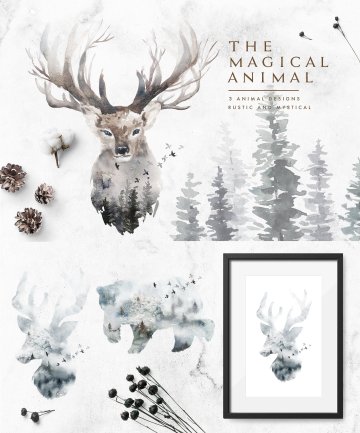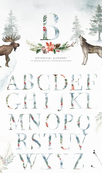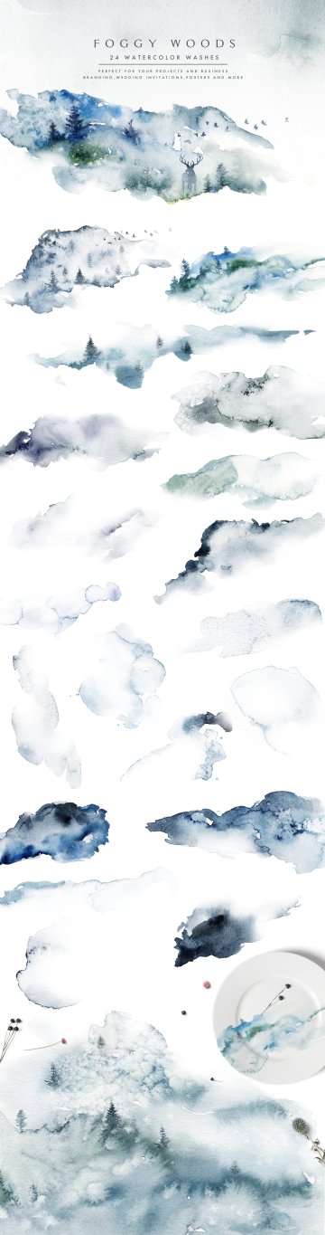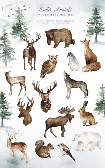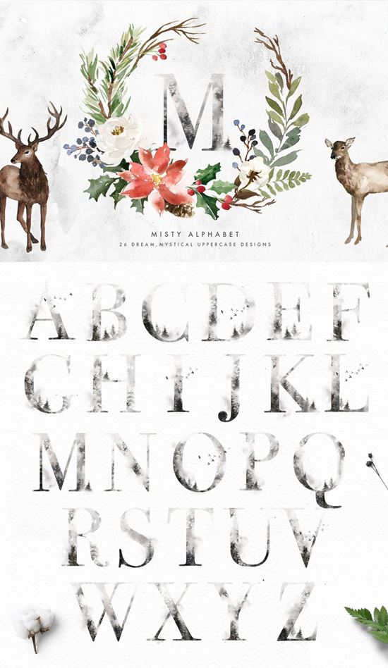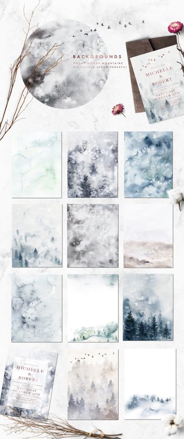 我很高兴地介绍神秘的冬天,一个神奇的,梦幻般的水彩冬季系列!这个产品包含许多神奇的冬季动物,雾森林背景,薄雾字母,花卉图形,冬季图案......等,适合多个项目,如最小的设计,豪华品牌,婚礼请柬等。
