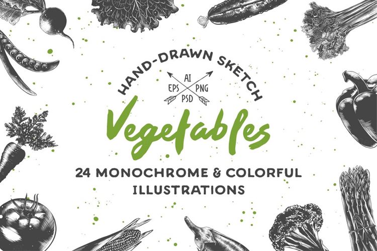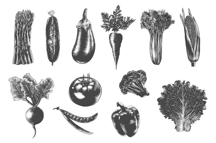 12单色和12多彩手绘蔬菜草图的集合。可用于徽标设计,徽章设计,徽章,商店标志,装饰,版画,海报等等。