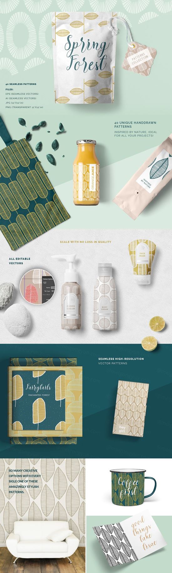 春季森林图案系列可以作为品牌项目,包装,时尚服装,海报,传单,壁纸的背景,或者只是在网上尝试它们作为背景(参见预览照片以获得更多灵感)!